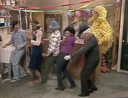 SCENE 4 | Mr. Macintosh puts on a record from the good ol' days and leads everyone in doing the "Sesame Street Shuffle." Poco Loco announces the sponsors. |