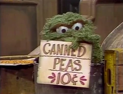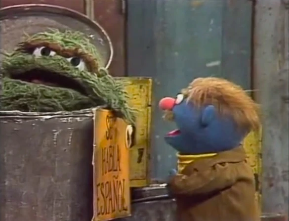 SCENE 1 | Oscar has been given a bunch of old signs by Mr. Hooper and shows them to the viewer. He finds one that reads "Se Habla Español," then hooks it onto his trash can as he continues rummaging through his new collection. A Muppet woman (voiced by Sonia Manzano) comes by, sees the sign and starts rapidly speaking Spanish to Oscar. He finally gets a word in edgewise ("Hold your caballos!") and points out that he doesn't speak Spanish. The woman, who can speak English just as well, claims that since he had the sign she assumed he spoke Spanish as well. She becomes upset with him and storms off. |