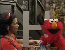 SCENE 5 | Maria finds Elmo (Brian Muehl) in the yard polishing a metallic letter H. She greets him, interprets his mumbles, and tells him that it's the letter H. Following more mumbles, she assumes he wants to know the sound of the letter H, so she produces it. The two keep repeating the letter's sound close to the H, and Elmo uses a rag to polish the spot they just breathed on. Maria does a take to the camera. |