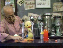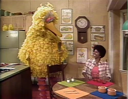 Insert | Sitting at the counter in Hooper's Store, Big Bird wonders what it would be like to be short, so he tells Mr. Hooper he's going to do some imagining. He closes his eyes and Big Bird sees himself small enough to walk around on the counter where he interacts with, compared now to his tiny stature, is a large bowl of ice cream and large squeak toy which scares him now because he's so small. When Mr. Hooper cleans up, Big Bird notes that he's now too small to notice, so he imagines himself back to reality. Mr. Hooper leans in to Big Bird from overhead to excuse himself, making Big Bird wonder if he's still imagining. The camera pulls back to reveal Mr. Hooper standing on a step ladder, and Big Bird resolves to being his normal size again. (First: Episode 0212) |