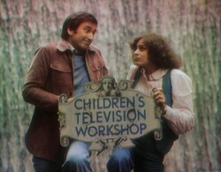 CLOSING SIGNS | Linda holds the Sesame Street sign, while she and Bob hold the CTW sign. |