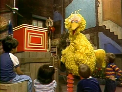 SCENE 2 | Big Bird shows the kids his new invention, which he believes will soon be in every American home. The box will help them figure out the number of the day, activated when they count up to the number. Big Bird and the kids make it to 9, when the box opens, shooting out balls, snakes, smoke, balloons, flags and confetti. |