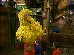 SCENE 2 | Big Bird plays "Follow the Tweeter" with some kids. They pretend to be chickens scratching for worms and preening their feathers, then baby birds as they go into Big Bird's nest to snack on some raisins. Big Bird offers to show them how to lay an egg next week (provided he can learn how before then). |
