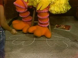 SCENE 4 | Big Bird reads an ad from the Bunion Shoe Co. that guarantees to make a perfect pair of shoes for anyone based on the outline of their feet. Jessica and Lisa help him by using chalk to draw his footprints, but Luis points out that they should have done the drawing on paper rather than on the pavement to make it easier to mail. "Does anybody have a jackhammer?" Big Bird inquires. |