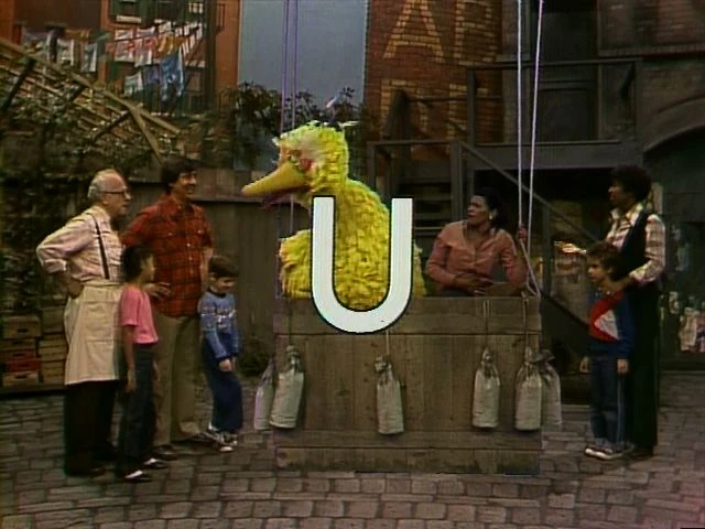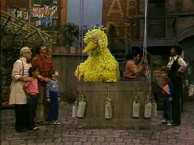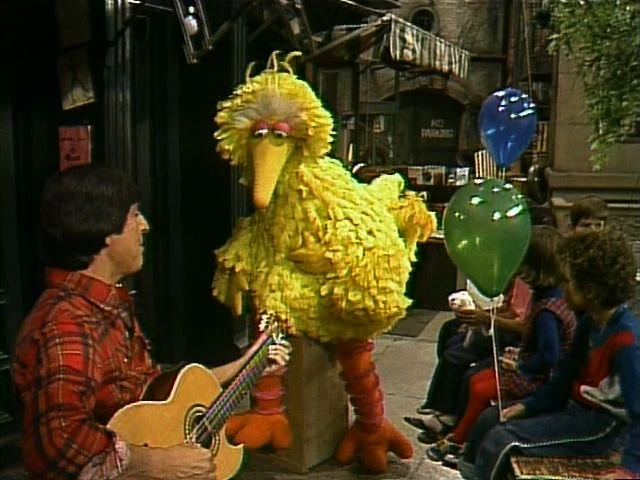 SCENE 3 | Some kids hold a live pigeon as Luis sings them "La Paloma." At first, Big Bird thinks that pigeons will help lift him off the ground, but one of the kids lets go of their balloon and Big Bird notices how the balloon floats up to the sky. He becomes reinspired and runs off to prepare for his "big takeoff." |