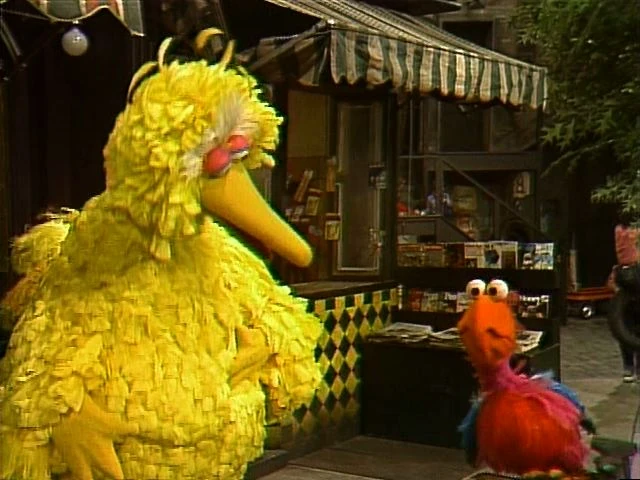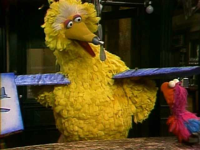 SCENE 1 | Big Bird is upset about being unable to fly. Poco Loco suggests he could flap his wings hard like he does, but that doesn't work. Big Bird then attempts a running start and just ends up crashing offscreen. They hear a motor and look up in the sky to see an airplane, and Big Bird suddenly gets inspired and rushes off. |