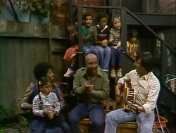 SCENE 5 | The cast congregates on the stoop as Luis plays "La Bamba" while playing his guitar. He begins to announce the sponsors when the Countess returns to count up to today's number. Oscar the Grouch helps her out so another rainstorm can begin. Luis also announces today's word... "agua," as well as the CTW slogan. |