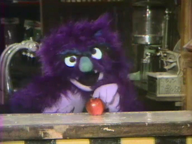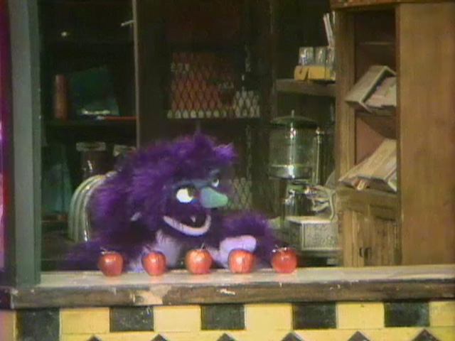 Muppets | A furry, purple creature whooshes to the counter of Hooper's Store and counts 5 apples. He subtracts one, leaving 4. (First: Episode 0400) |