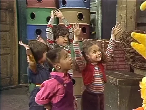 SCENE 2 | Big Bird tells the kids that he's always wanted a flower garden around his nest, so he wants them to be his make-believe garden. Big Bird pretends he's a farmer, and the kids pretend to be the seeds he plants that sprout into flowers. The kids gather around Big Bird for a hug, and he calls them "a big, beautiful bouquet." |