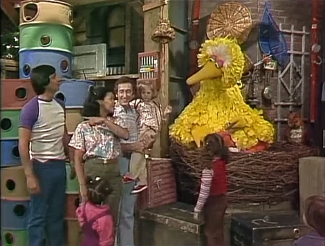 SCENE 5 | Now morning, Big Bird and Howlie both decide to turn in for the day. Suddenly, Big Bird is awakened by his alarm clock. Bob, Maria, and Luis enter the nest with the kids; Holly hands Big Bird a bag of birdseed for breakfast. They remind him of today's trip to the park and tell him they'll be waiting at the bus stop. All the commotion doesn't stir Howlie, who is fast asleep. Big Bird wearily announces the sponsors. |