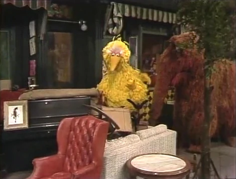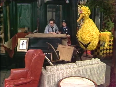 SCENE 4 | Big Bird and Snuffy have pushed all of Bob's furniture outside the building. Snuffy darts off to his cave to check if he forgot anything else just as Bob and Officer Landon exit the building. Bob is surprised that all his furniture is returned and has a hard time explaining Big Bird's side of the story to the officer. Snuffy announces the sponsors, and the credits roll. |