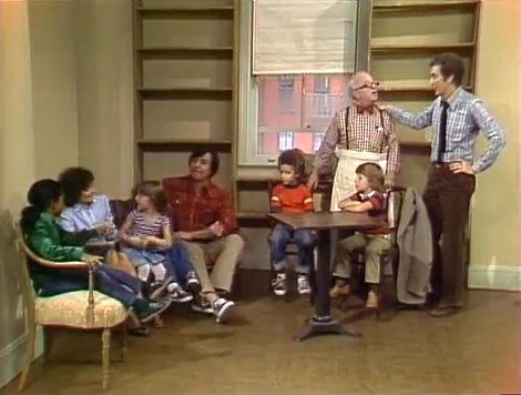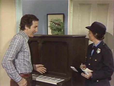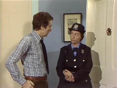SCENE 2 | Bob uses the phone, the only thing left behind, to call the police about his situation. In the meantime, Mr. Hooper and the kids bring up the table and chairs from the yard for Bob to use. Luis and Linda then arrive with Linda's small couch. Officer Landon (Dale Soules) arrives and thinks she's in the wrong place - Bob's report said his apartment was empty, but it looks pretty full to her. |
