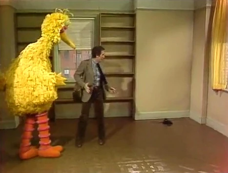 SCENE 1 | Bob returns from his concert tour and Big Bird reports he did a good job watching his apartment while Bob was gone, with some help from Mr. Snuffleupagus. They arrive at Bob's place to find everything is missing. Big Bird explains that he and Snuffy got bored while watching the stuff, so they brought it all to Snuffy's cave while they played there. Bob is instead convinced somebody broke in and stole everything. He resolves to call the police, despite Big Bird's protests. |
