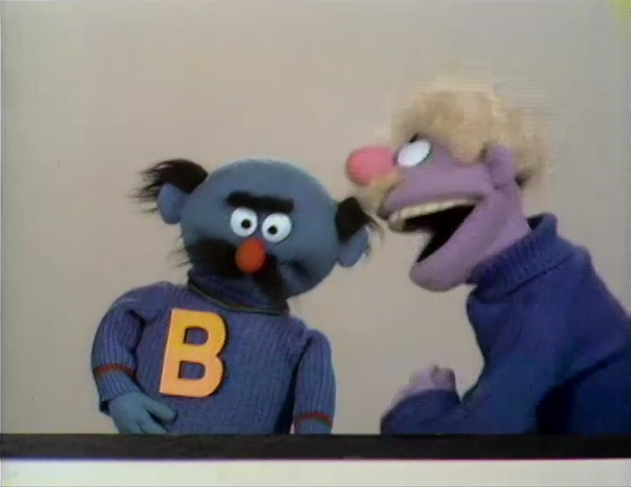 Muppets | Harvey Kneeslapper asks a man, "Do you know where I wanna be?" The man says he doesn't know. Harvey says, "I wanna B -- right here!" and slaps a letter B on the man's sweater. Harvey runs off, laughing. (First: Episode 0277) |