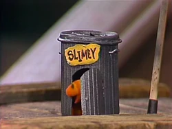 SCENE 3 | Maria is confused by a sign posted near Oscar's trash can - "Beware of the Worm." She knocks on Oscar's can when suddenly Slimey pops his head out of his own miniature trash can and starts yelping at her like a dog. Oscar informs Maria that Slimey has taken up the job of "watchworm" to protect the house. Maria doesn't think Slimey is the least bit threatening to ward off any unwanted visitors, going so far as to call him a "pipsqueak." Oscar agrees, so Slimey has a partner - Anthony, Oscar's tiger, whose roar inside the can sends Maria slinking away. Oscar thanks Anthony for his work: "That was grrrreat!" |