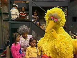 SCENE 1 | David's grandma Grace is back visiting Sesame Street, and Big Bird watches as she puts Celia's hair in cornrows. He learns about how the style had started in Africa, and is a tradition that has been passed down through history for about 3,000 years. Big Bird observes that they're similar to how Olivia sometimes wears her hair, and Sharita shows Big Bird the set of beads in her cornrows. Big Bird learns that the style isn't just for black people, as Grace explains that other people find it fashionable - including Big Bird, who wants his feathers cornrowed as well! |