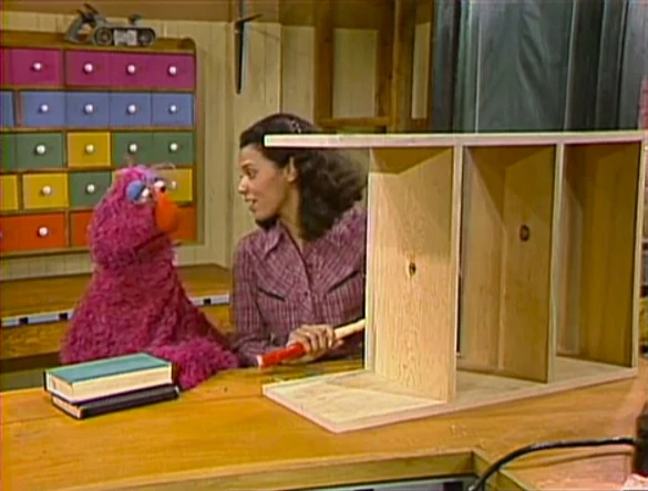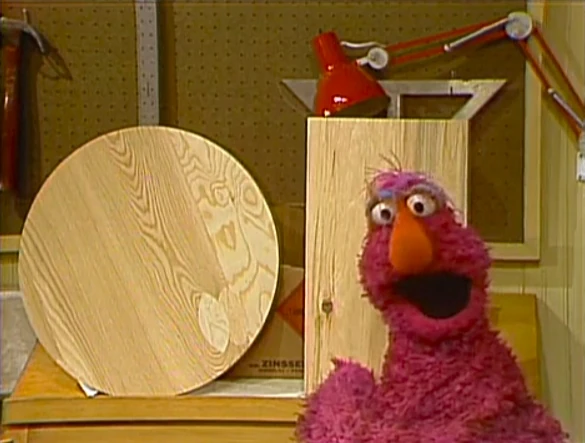 SCENE 4 | Maria is almost finished building a bookcase for Telly Monster at the Fix-It Shop and asks him to get one more board from across the room. Telly can't figure out which board to get - a round one or a rectangular one. Since the other boards making the bookcase are rectangular, Maria helps him realize that a similar board is what they need. He notices his books are also rectangular and worries what kind of bookcase he'll need if he gets any round or triangular books. |