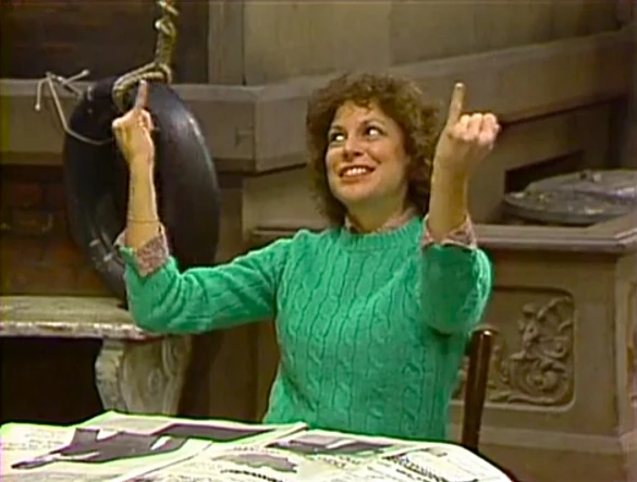 SCENE 5 | Linda signs the letter C for the word "cat." Timi appears in an oval onscreen to translate, and a Muppet cat (Michael Earl) leaps up on Timi's shoulder to give her a lick. |
