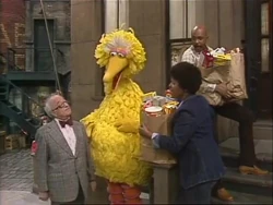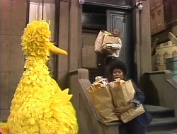 SCENE 5 | Big Bird sees Susan carrying tons of groceries back from the store. She is very annoyed because Gordon was supposed to help her, but he was nowhere to be found. Big Bird knows where he is and spots Gordon coming in from the other way, having gone to a separate grocery store. Gordon tries carrying his own heavy load of groceries inside and doesn't see Susan, but echoes the same frustrations. |