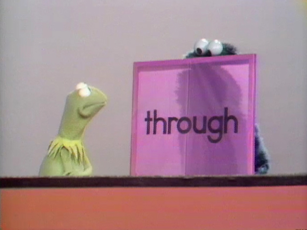 Muppets | Kermit Lecture: Through — To demonstrate "through", Kermit tries to get Cookie Monster to run through a piece of tissue paper. (First: Episode 0289) |