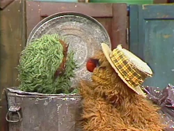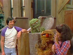CLOSING SIGNS | David holds the Sesame Street sign, while Oscar holds the CTW sign. |