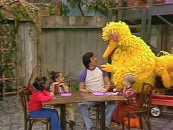 SCENE 1 | Luis invites Big Bird to join himself and two kids in some drawing. Big Bird isn't in the mood and wanders off. The four of them are left with a problem: there are only two crayons and two pieces of paper. Luis encourages the kids to come up with a solution: they'll split each of them in half. Big Bird returns, having changed his mind and takes Luis' paper and crayons, assuming he'd anticipate his return. Big Bird and the kids decide to draw R2-D2, a house, and a bear. |