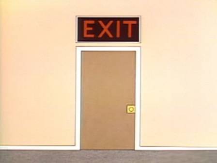 Cartoon | A man sees a giant OUT, yells the word, and everyone runs out of it. (First: Episode 0550) |