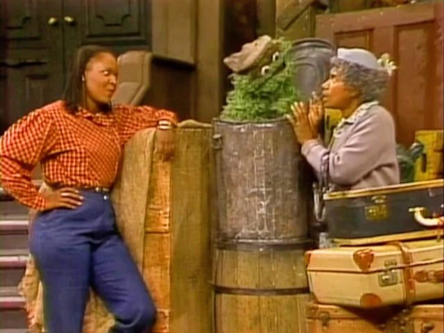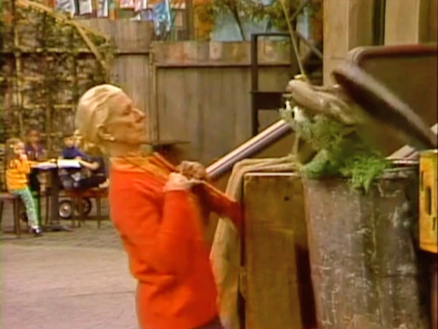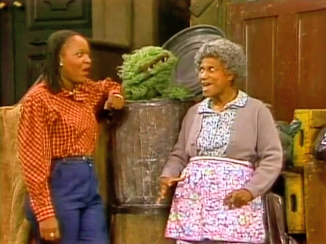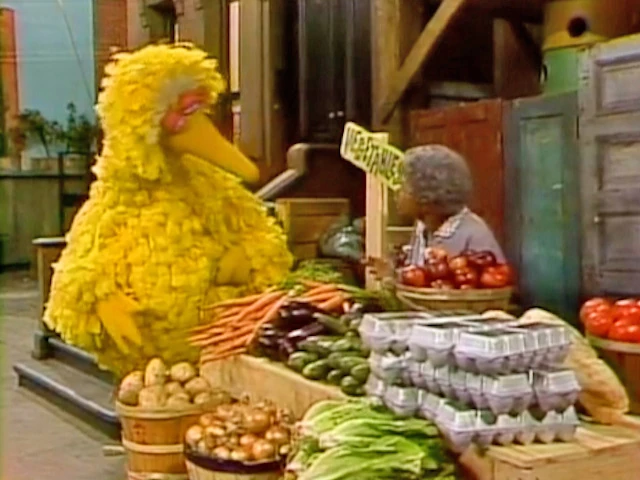 SCENE 5 | Grandma promises Oscar will be left alone as she returns to her stand. Big Bird approaches with a basket, repeating "Gordon, Susan, Olivia, Luis" to himself. He tells her he's meeting them for a picnic in the park and recites their names as a way of remember how many apples he needs. Grandma instead has him count the people, which makes it easier. She's unable to break his dollar and Oscar goes berserk when Big Bird knocks on his can to get some change. |