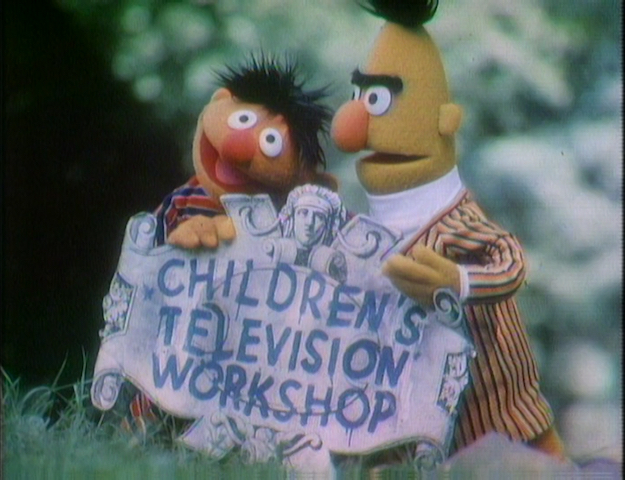 CLOSING SIGNS | Susan holds the Sesame Street sign, while Ernie and Bert hold the CTW sign. |