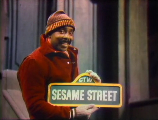 CLOSING SIGNS | Gordon holds the Sesame Street sign, and Telly holds the CTW sign. |