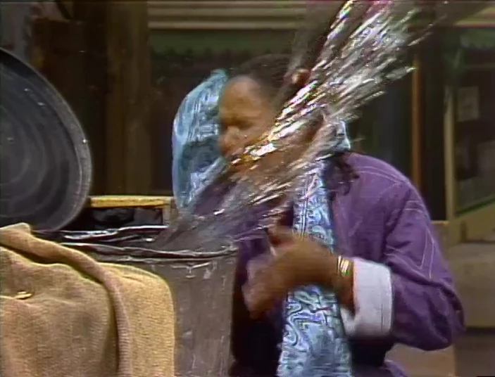 Muppets | Harvey Kneeslapper sets up a bucket of confetti above a door, so that whoever pulls the rope attached to the bucket will get the confetti dumped on them. Instead, a little girl walks by and pulls the rope, so that the confetti lands on Harvey! (First: Episode 0353) |
