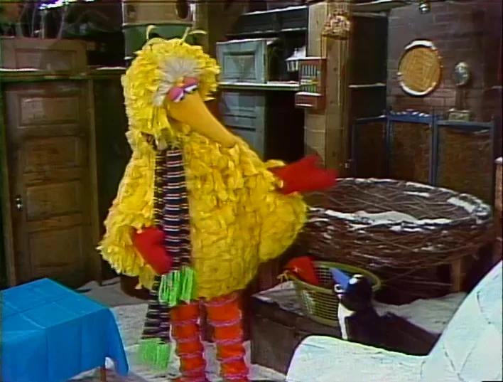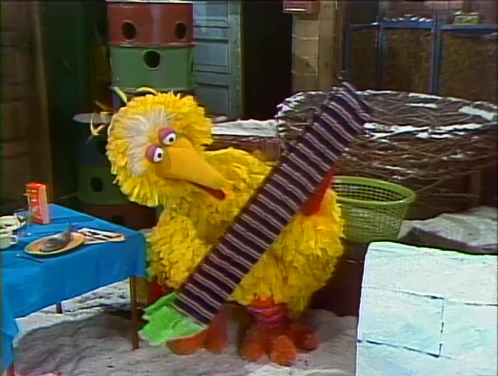 SCENE 3 | Big Bird and Zero divide up the chores - Big Bird will make lunch while Zero does their laundry. He accomplishes this by breaking the ice in the pool inside his igloo, dumping the clothes in the water with detergent, and swimming around in circles. Later, Big Bird has set the table for lunch while Zero brings out the laundry, which is all frozen stiff. Big Bird decides they should swap roles tomorrow. |