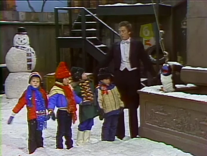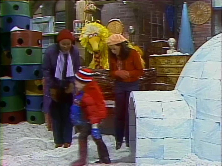 SCENE 5 | Maria asks Olivia where the kids are, having invited them to lunch but none showed up. They check by Big Bird's nest, where Big Bird directs them to Zero's igloo. Zero claims there's no one inside "but us penguins," as the kids emerge acting like penguins. Zero announces the sponsors as Olivia and Maria crawl inside the igloo. |