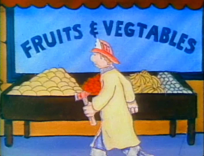 Cartoon | A voiceover asks kids to name where a fireman and policewoman work. (First: Episode 1463) |