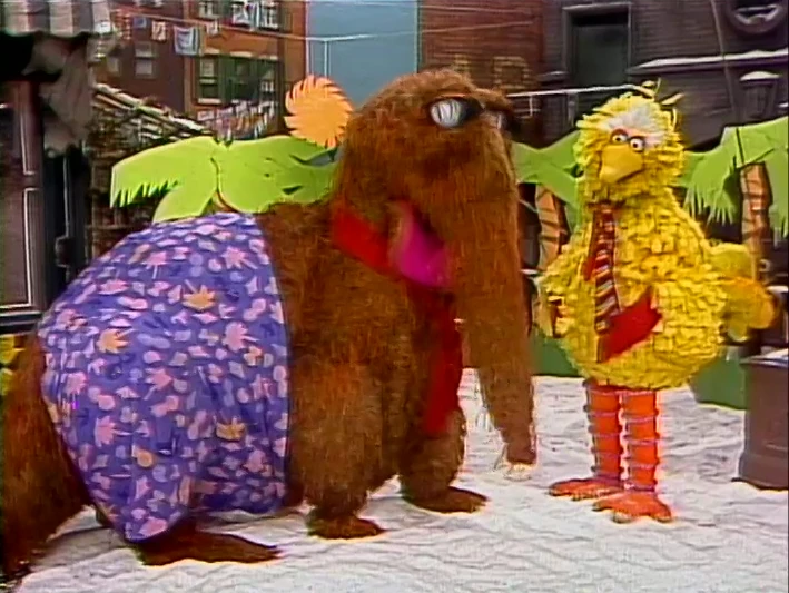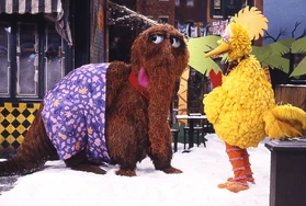 SCENE 1 | Mr. Snuffleupagus comes over to meet Big Bird's friends, but no one seems to be around in the chilly weather. Maria's cousin Mercedes makes a mad dash back to 123 Sesame Street from Hooper's Store, barely noticing the two because of her fur hood. Big Bird explains to Snuffy how she's not used to the cold because it's always warm in Puerto Rico. Snuffy thinks they can bring Puerto Rico to Sesame Street by getting 500 Snuffleupaguses to move it, but comes up with a better idea - making Sesame Street look like Puerto Rico. |