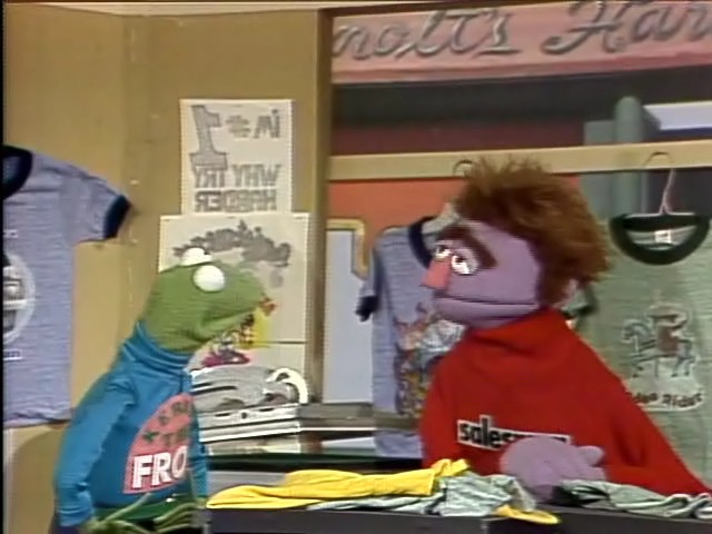 | Muppets | Kermit the Frog goes to a T-shirt shop, The Wonderful World of T-Shirts, to pick up another personalized "Kermit the Frog T-Shirt". However, all the shirts have the wrong name (Kermit the Gorf, Kermit the Forg, and Kermit the Grof). (First: Episode 1494) | |