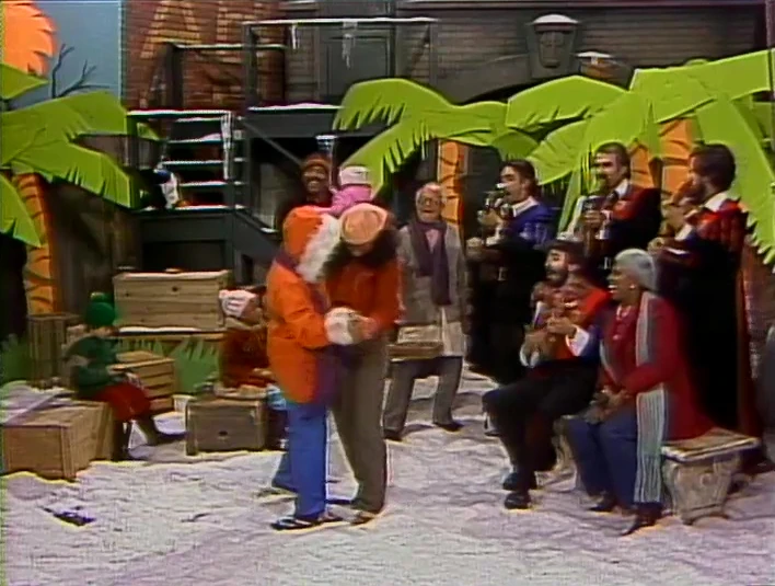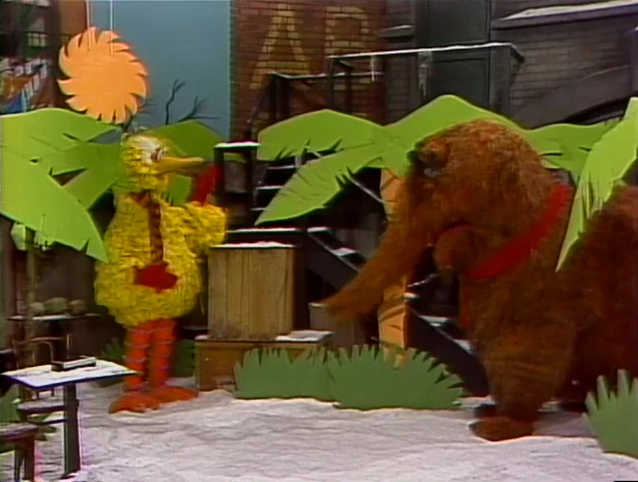 SCENE 2 | Snuffy and Big Bird have set up some two-dimensional palm trees and a sun in the yard. Big Bird also has a tape recorder of sounds he recorded from his trip to Puerto Rico, complete with the sounds of the shore and some coquí chirps. Big Bird runs off to fetch Mercedes and company, making Snuffy promise he won't move. Snuffy realizes he needs his bathing suit to properly simulate Puerto Rico and runs off to get it. Big Bird leads Maria, Mercedes, Gordon and Susan out to their faux-Puerto Rico. Mercedes says it feels like home and Maria proposes they grab their bathing suits and wear them over their coats. The others find it silly (save for Big Bird), but agree to get some beach balls, towels, shovels, etc. |