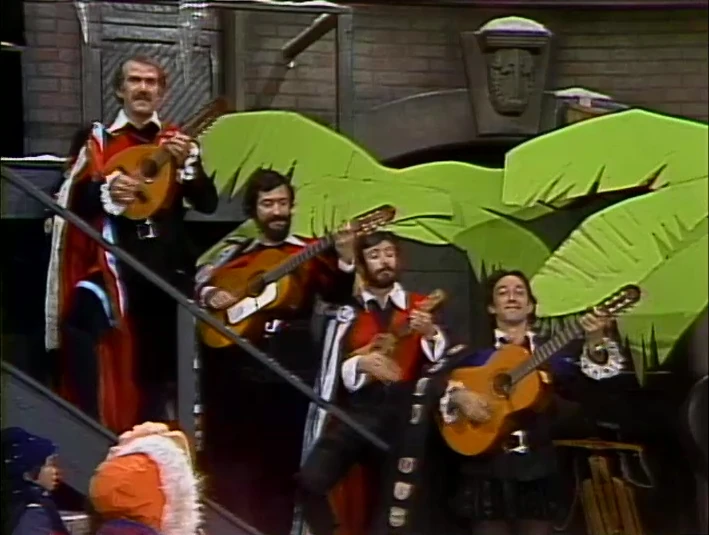 SCENE 4 | Maria calls everyone over to hear a singing tuna. Big Bird and Zero assume this means a fish, but Maria clarifies that a "tuna" refers to a performance tradition carried over from Latin America and Spain. Some musicians arrive and explain their instruments and the importance of their costumes before playing "La Morena de Mi Copla" for everyone. |