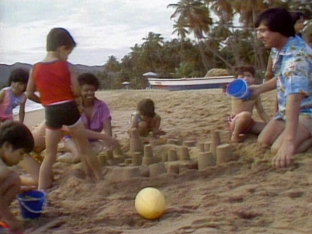 SCENE 8 | Luis, Susan, and the kids make sandcastles at the beach. A young child announces the sponsors entirely in Spanish. |