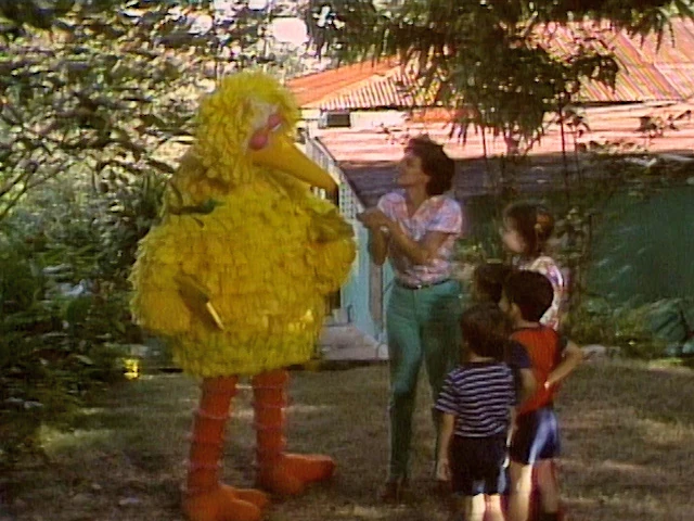 SCENE 7 | Big Bird hears a peculiar chirp-like sound coming from all over the place. He tries finding the source, believing it's coming from a fellow feathered friend. He grabs some birdseed to lure the creature out, having no luck. He eventually finds himself back Marguarita's yard, where Maria explains the sound is coming from a coquΓ, a type of frog native to Puerto Rico. The kids catch one and show Big Bird, who remarks, "Wait'll I tell Kermit the Frog about this!" |