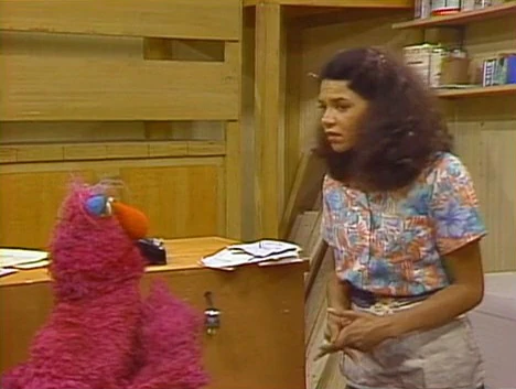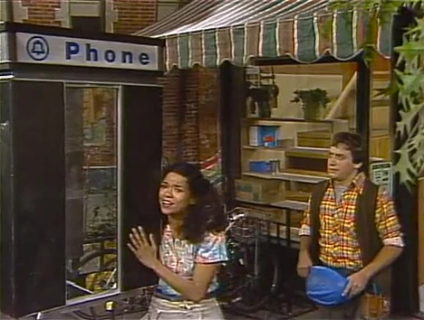SCENE 1 cont'd | Bob enters the shop and interrupts Maria, asking if he can use her telephone. He calls to reschedule a music lesson, when Telly arrives. He calls out Maria from the back room. She tells him that she hasn't gotten around to fixing his toaster, but he too requests the use of her phone. He calls up the weather service and finds it's going to rain. Soon after, Big Bird disturbs Maria, looking for Mr. Snuffleupagus (the exterior of the shop is their rendezvous point). He also uses her phone to call Snuffy and leaves to go to his cave instead. After that, a man from the telephone company (Marc Weiner) interrupts Maria, who is ecstatic to see they've installed a new pay phone right outside the shop, meaning no more disruptions. Telly then comes in to deliver the good news to Maria. |