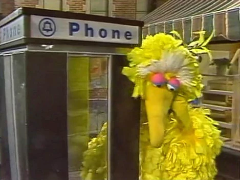 SCENE 2 | Big Bird strolls down the block (singing "ABC-DEF-GHI" to himself) and discovers the new phone booth installed in front of the Fix-It Shop. He wonders if Maria has found out about it and decides to call her; all he needs is a dime. He goes into the store and disrupts her work to get change for the phone. He makes his way back to the booth and calls Maria inside the store to tell her about the new phone. |