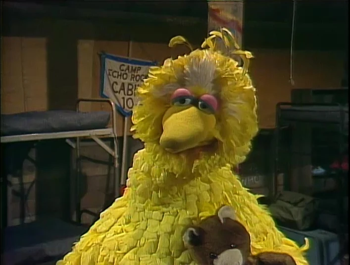 SCENE 5 | It's nighttime, and Big Bird realizes how homesick he is. He imagines what Maria and Mr. Hooper would be doing if he were back on Sesame Street, and begins to cry when it becomes too much to think about. Mickey tells him it's natural to be homesick, and that it's okay to cry. Rusty overhears the conversation and claims to Big Bird that his "friend" is homesick too, and they end up crying together. They feel better afterward, and Big Bird compliments Rusty's crying ability. |