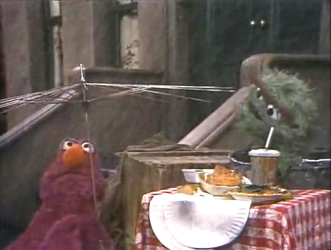 SCENE 3 | As it still rains, Telly Monster brings Oscar the Grouch the food and supplies he needs for his Grouch picnic. Telly begs Oscar to hurry and check everything since he's standing in the rain. Oscar provides him with an umbrella, naturally with no cover. Oscar finally consults his list and finds everything has gone according to plan - he has everything he needs for his picnic, and he ensured Telly got all wet by keeping him standing around. To Oscar's dismay, Telly is not annoyed, but rather glad at how great of a planner Oscar is. |