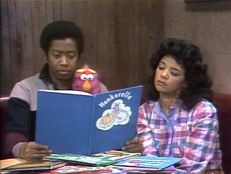 SCENE 4 | Mr. and Mrs. Honker leave their baby in the care of Maria and David at Hooper’s. The baby Honker starts sulking, and Maria tries to cheer it up with a doll and a rattle, neither of which work. Finally, she finds a Honker storybook of "Little Red Honkerhood," which she begins reading from; the book consists of only the word "honk." |
