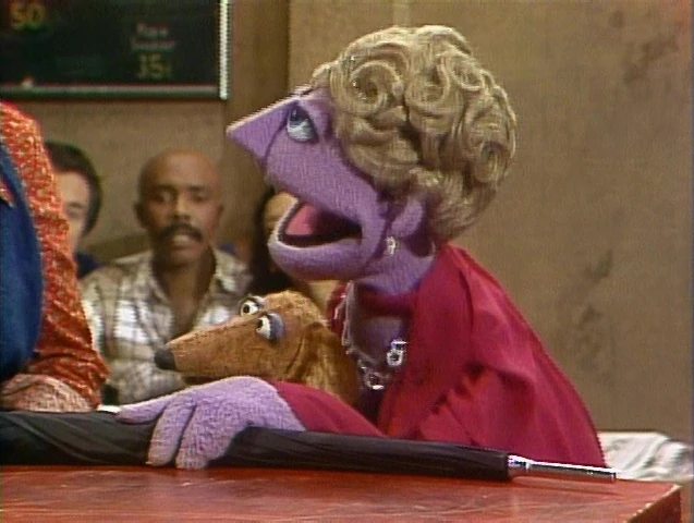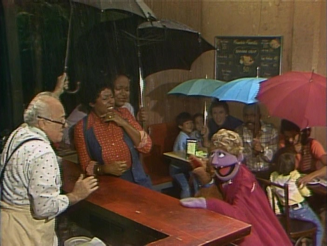 SCENE 2 | The adults in Hooper's Store are introduced to the Countess Dahling von Dahling and her dog Masha. Much like her 5th cousin Count von Count, she also loves to count. She's even brought gifts for everyone - umbrellas, which she counts as she passes them around. They come in handy when her trademark, post-counting rain beings pouring inside the store. She stops it by counting backwards. |