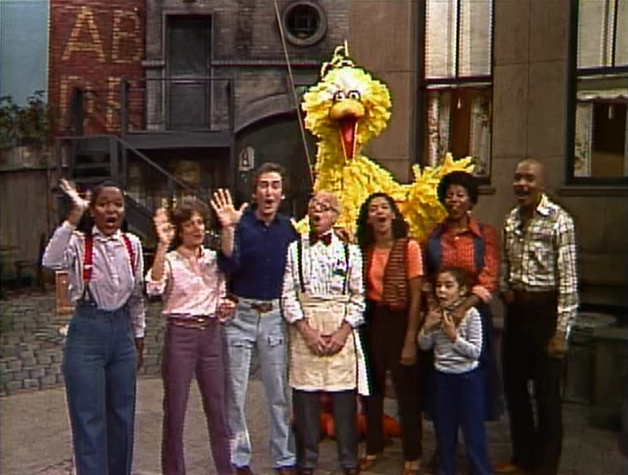 CLOSING SIGNS | Olivia holds the Sesame Street sign, while Bob and Linda hold the CTW sign. |