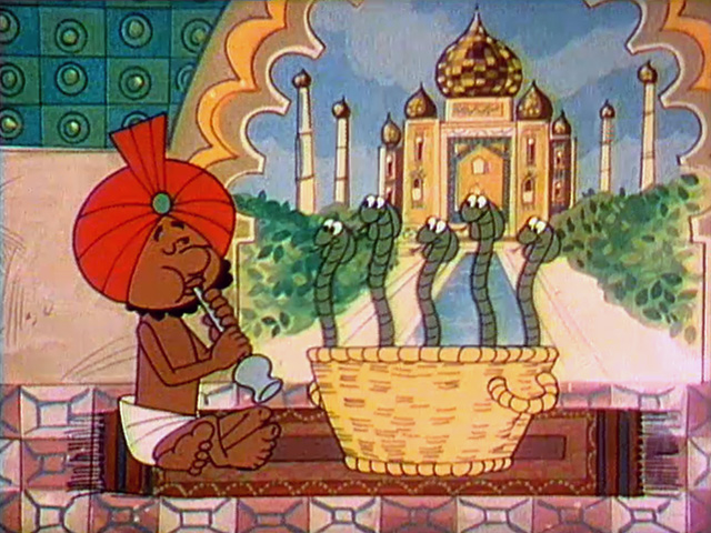 Cartoon | Five snakes come out of a basket when a snake charmer plays the flute. (First: Episode 0762) |