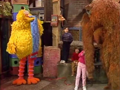 SCENE 2 | Big Bird gives Mr. Snuffleupagus a snuffle-warmer as a gift. Big Bird then receives a beak-warmer from him, knitted by his mommy. The kids help the two friends put them on, but since neither of theirs is the right length, Big Bird and Snuffy decide to trade warmers instead. |
