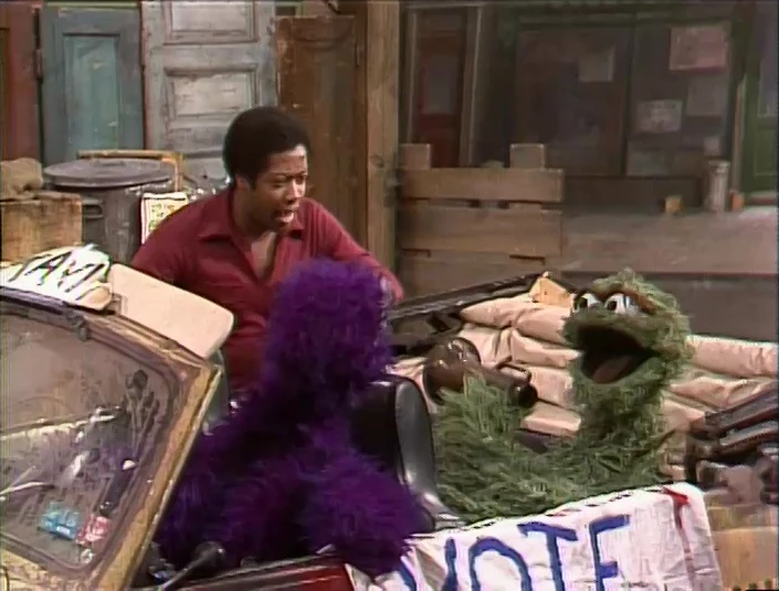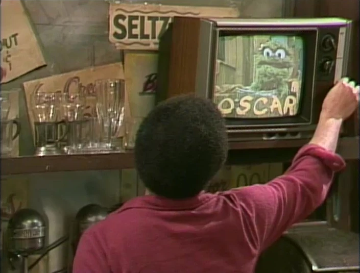SCENE 3 | In Hooper's Store, Oscar asks to have the TV turned on to show off his new campaign ad (paid for by the Vote for Oscar Or Else Committee): "A vote for Oscar is a vote for trash!" |